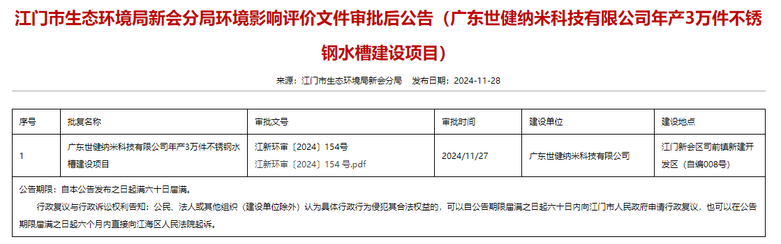 2024年11月28日,江門市生態(tài)環(huán)境局新會(huì)分局就廣東世健納米科技有限公司年產(chǎn)3萬件不銹鋼水槽建設(shè)項(xiàng)目環(huán)境影響評(píng)價(jià)文件作出審批意見并對(duì)外進(jìn)行公告,公告期限:自本公告發(fā)布之日起滿六十日屆滿。
